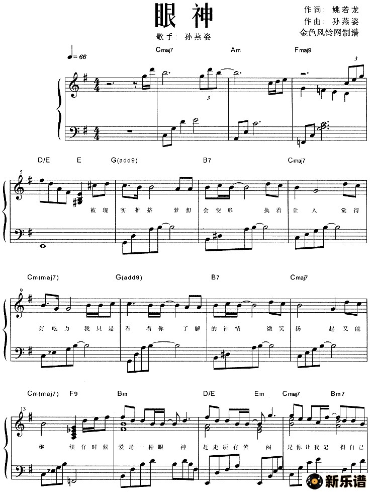 孙燕姿演唱的眼神歌词,眼神钢琴谱.