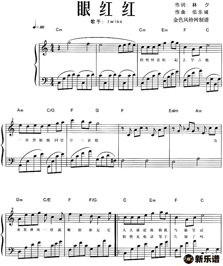 Twins演唱的眼红红歌词,眼红红钢琴谱.