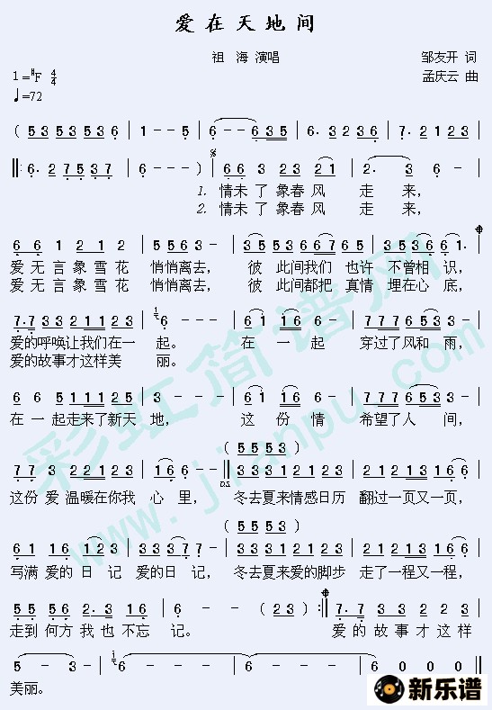 祖海演唱的爱在天地间歌词,爱在天地间简谱.