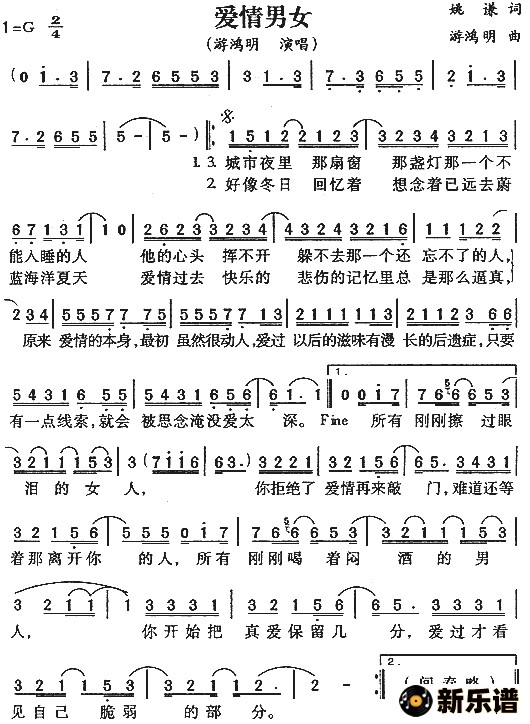 游鸿明演唱的爱情男女歌词,爱情男女简谱.