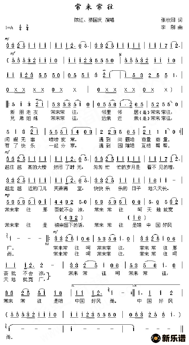 陈红/蔡国庆演唱的常来常往歌词,常来常往简谱.