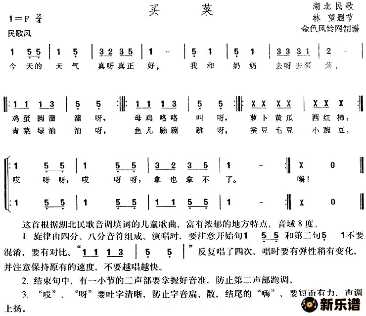 演唱的买菜(湖北民歌、儿童歌)歌词,买菜(湖北民歌、儿童歌)简谱.