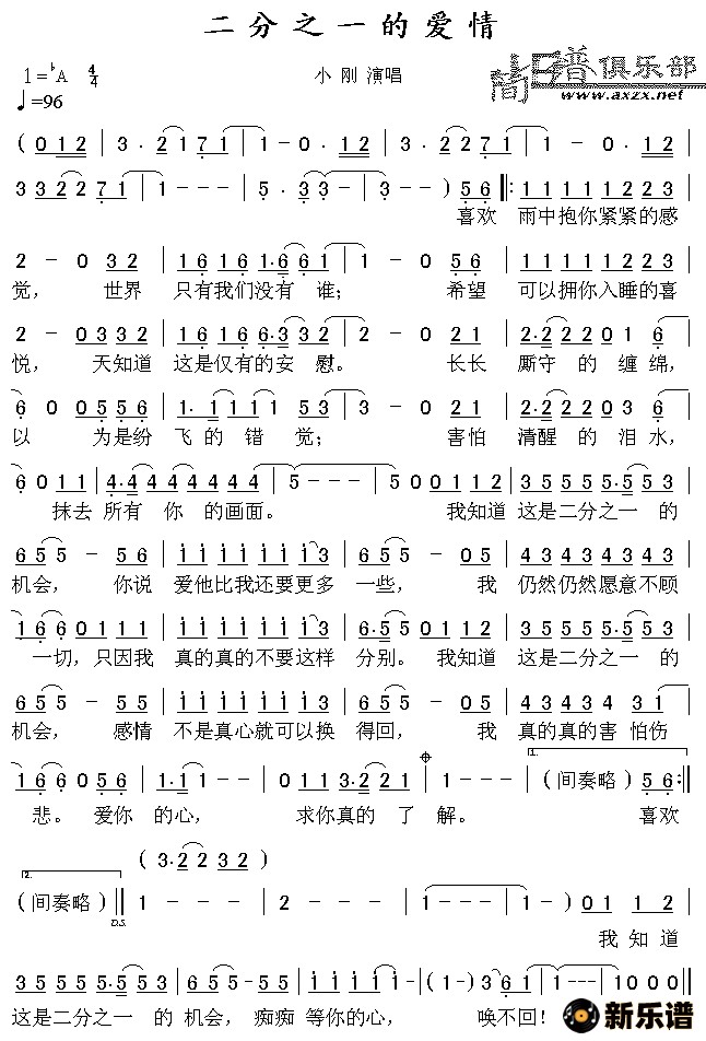 小刚演唱的二分之一的爱情歌词,二分之一的爱情简谱.