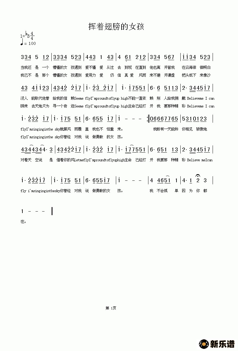 挥着翅膀的女孩最新曲谱