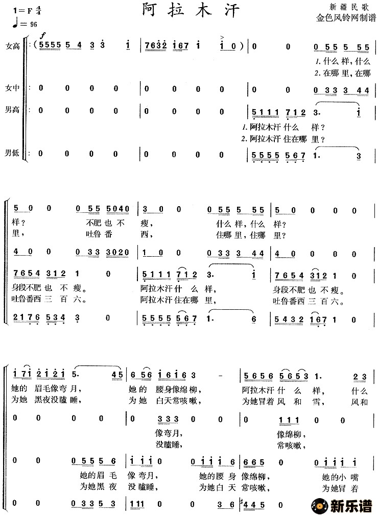 演唱的阿拉木汗(新疆民歌)歌词,阿拉木汗(新疆民歌)简谱.