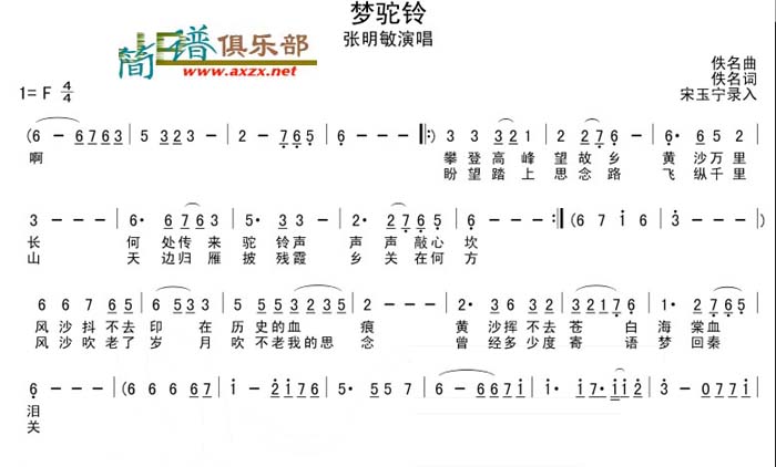 张明敏演唱的梦驼铃歌词,梦驼铃简谱.