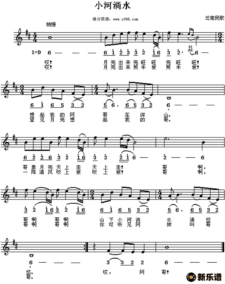 云南民歌演唱的小河淌水歌词,小河淌水简谱.