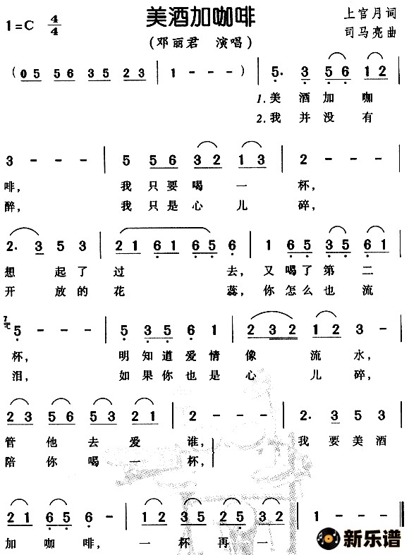 邓丽君演唱的美酒加咖啡歌词,美酒加咖啡简谱.