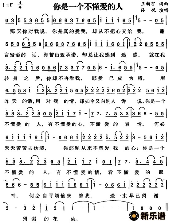 孙悦演唱的你是一个不懂爱的人歌词,你是一个不懂爱的人简谱.
