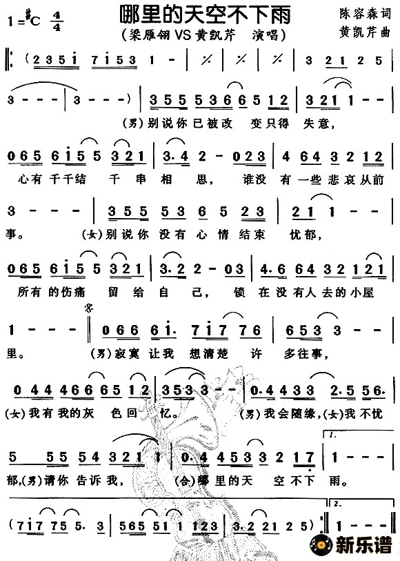 梁雁翎/黄凯芹演唱的哪里的天空不下雨歌词,哪里的天空不下雨简谱.