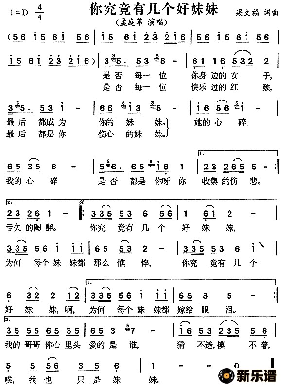孟庭苇演唱的你究竟有几个好妹妹歌词,你究竟有几个好妹妹简谱.