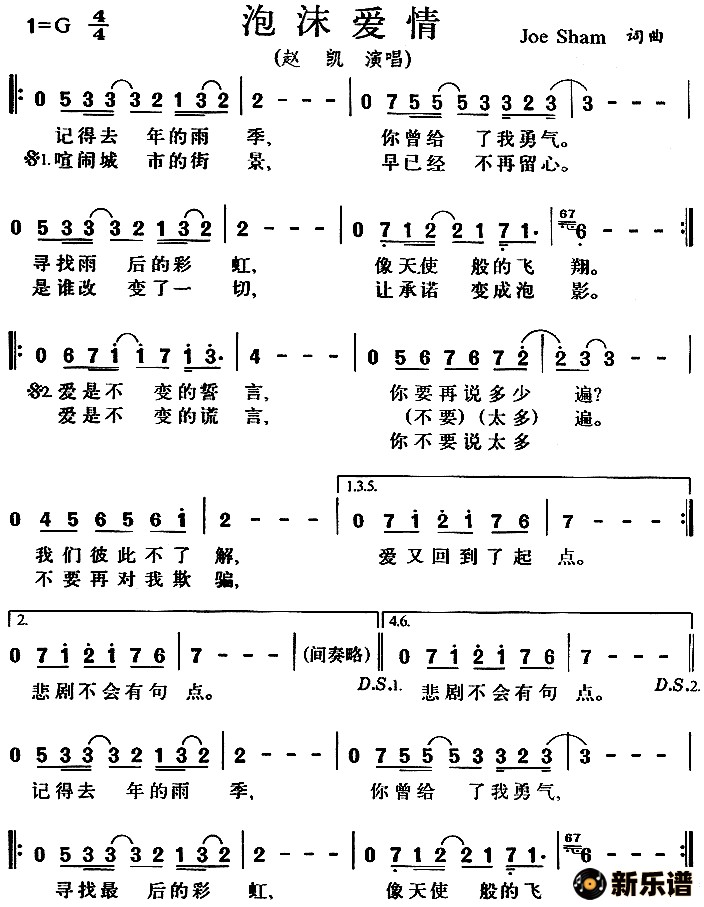 赵凯演唱的泡沫爱情歌词,泡沫爱情简谱.
