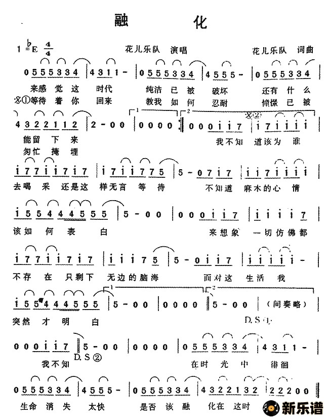 花儿乐队演唱的融化歌词,融化简谱.