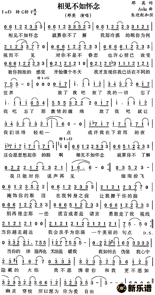 那英演唱的相见不如怀念歌词,相见不如怀念简谱.
