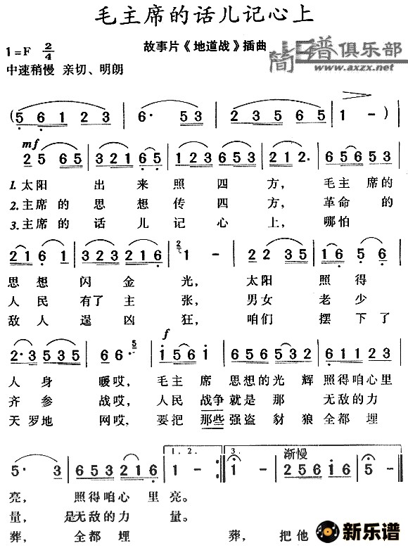 毛主席的话儿记心上(电影《地道战》插曲)最新曲谱