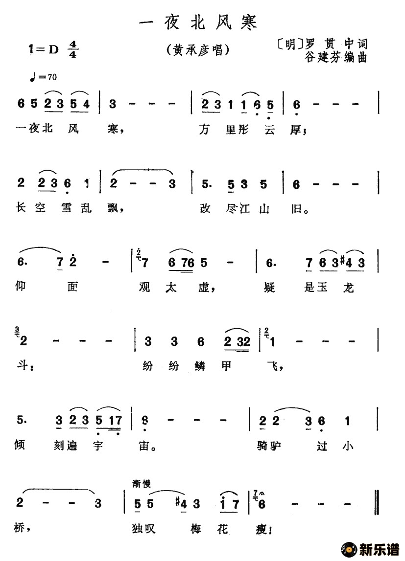 黄承彦演唱的一夜北风寒歌词,一夜北风寒简谱.