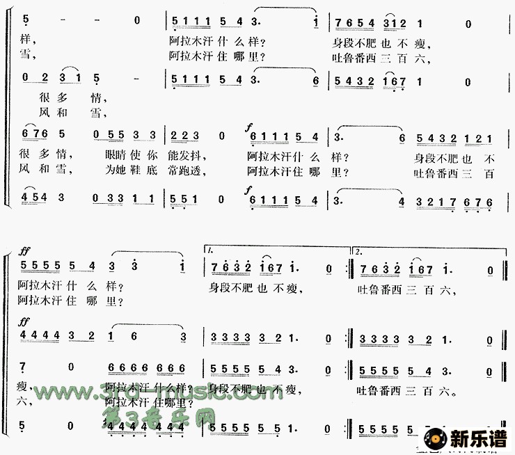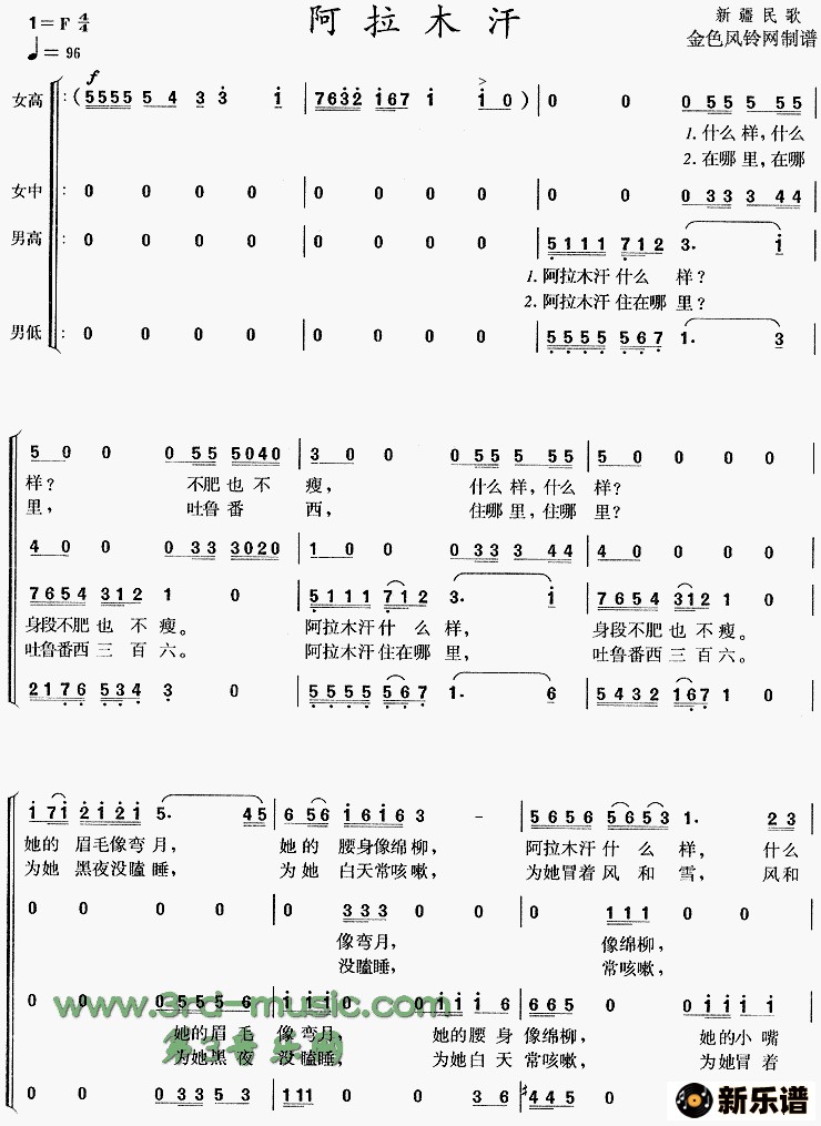 未知演唱的阿拉木汗(新疆民歌)[合唱曲谱]歌词,阿拉木汗(新疆民歌)[合唱曲谱]简谱.