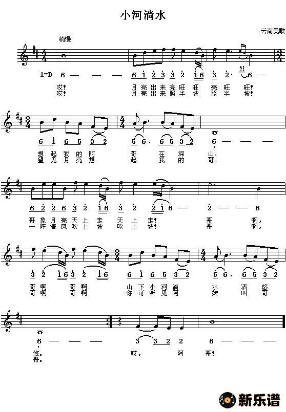 未知演唱的小河淌水(云南民歌)歌词,小河淌水(云南民歌)简谱.
