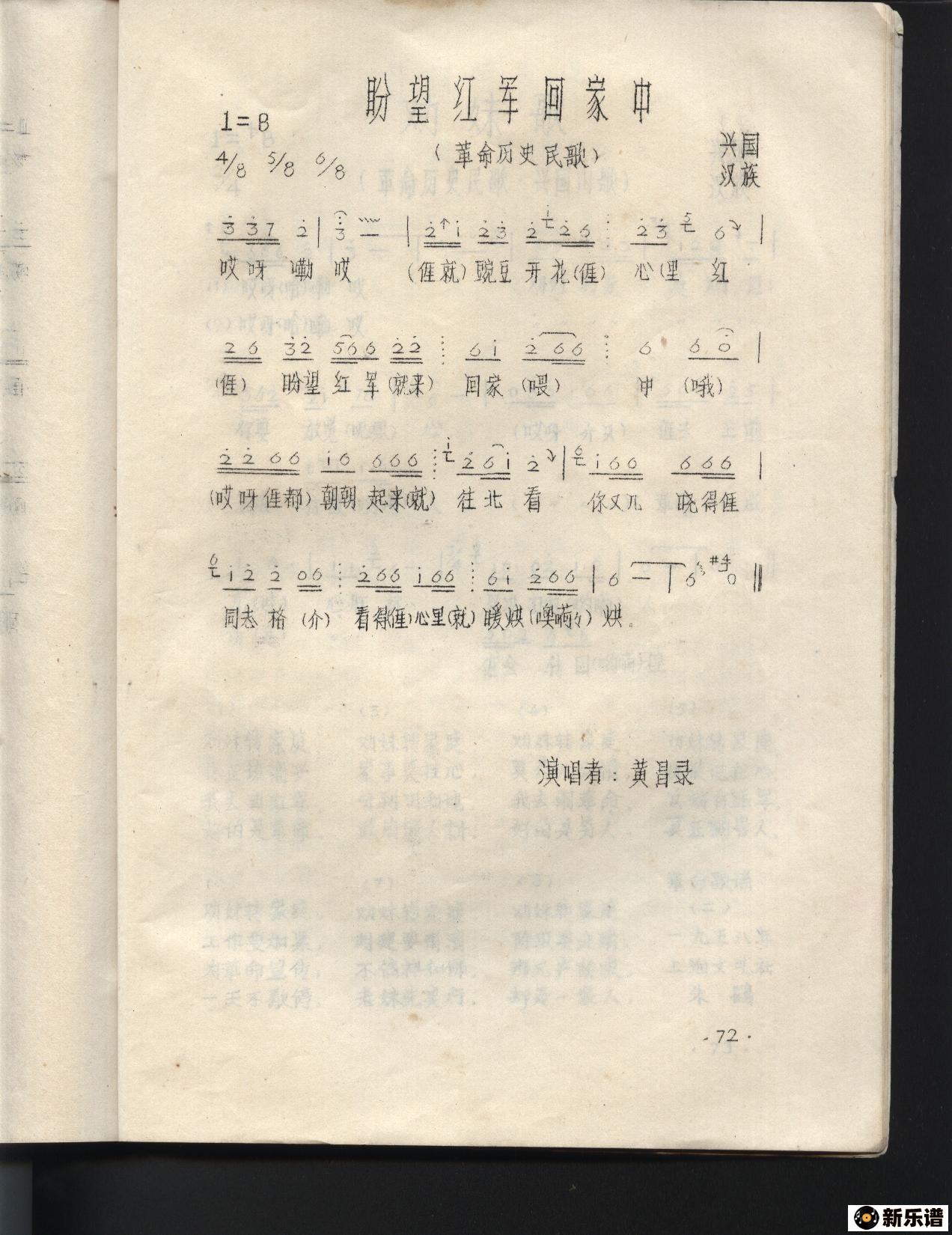 黄昌禄演唱的盼望红军回家来(江西兴国山歌)歌词,盼望红军回家来(江西兴国山歌)简谱.