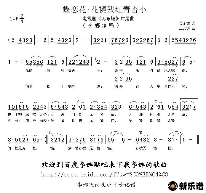 《蝶恋花.花褪残红青杏小》简谱 李娜-小叶子制谱