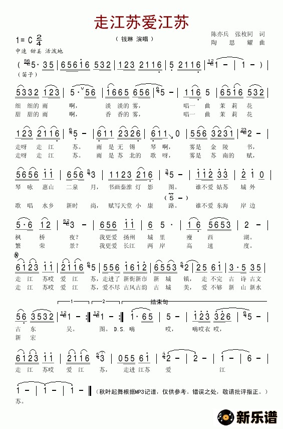 钱琳演唱的走江苏爱江苏歌词,走江苏爱江苏简谱.