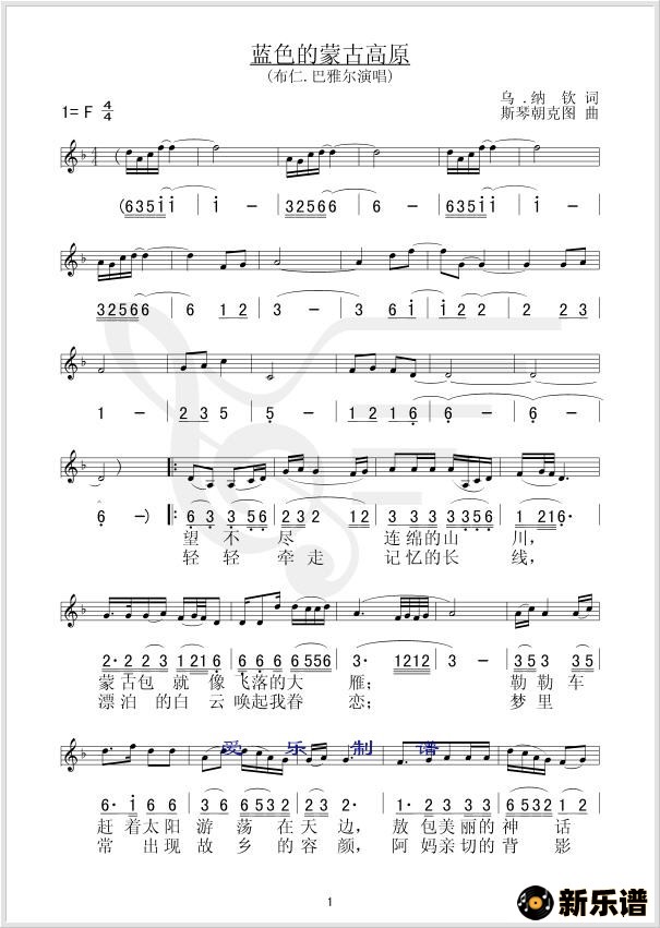 布仁巴雅尔演唱的蓝色的蒙古高原 五线&简谱歌词,蓝色的蒙古高原 五线&简谱简谱.