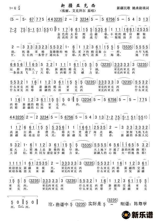 演唱的新疆亚克西歌词,新疆亚克西简谱.
