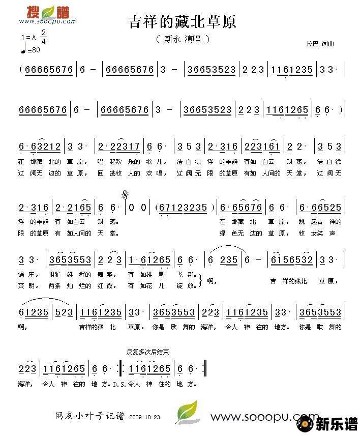 《吉祥的藏北草原》简谱 斯永-小叶子制谱