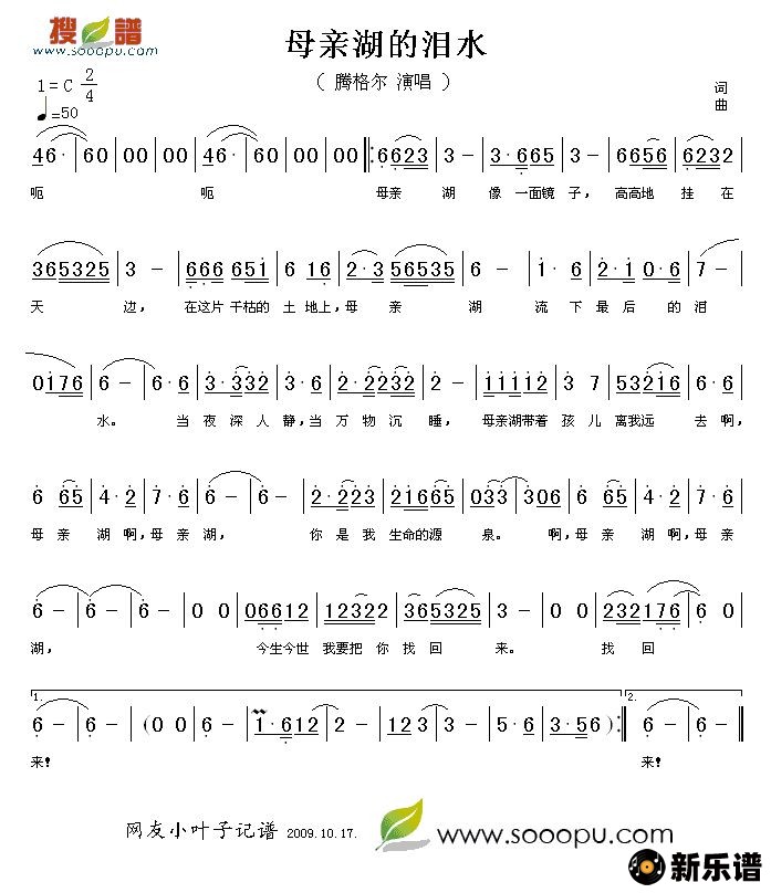 《母亲湖的泪水》简谱 腾格尔-小叶子制谱