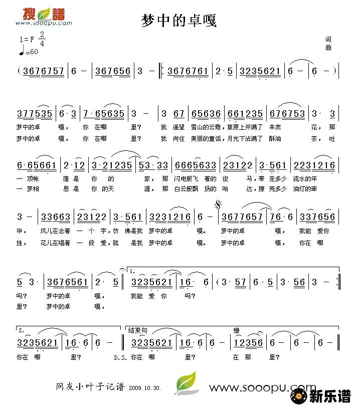 《梦中的卓嘎》简谱 -小叶子制谱