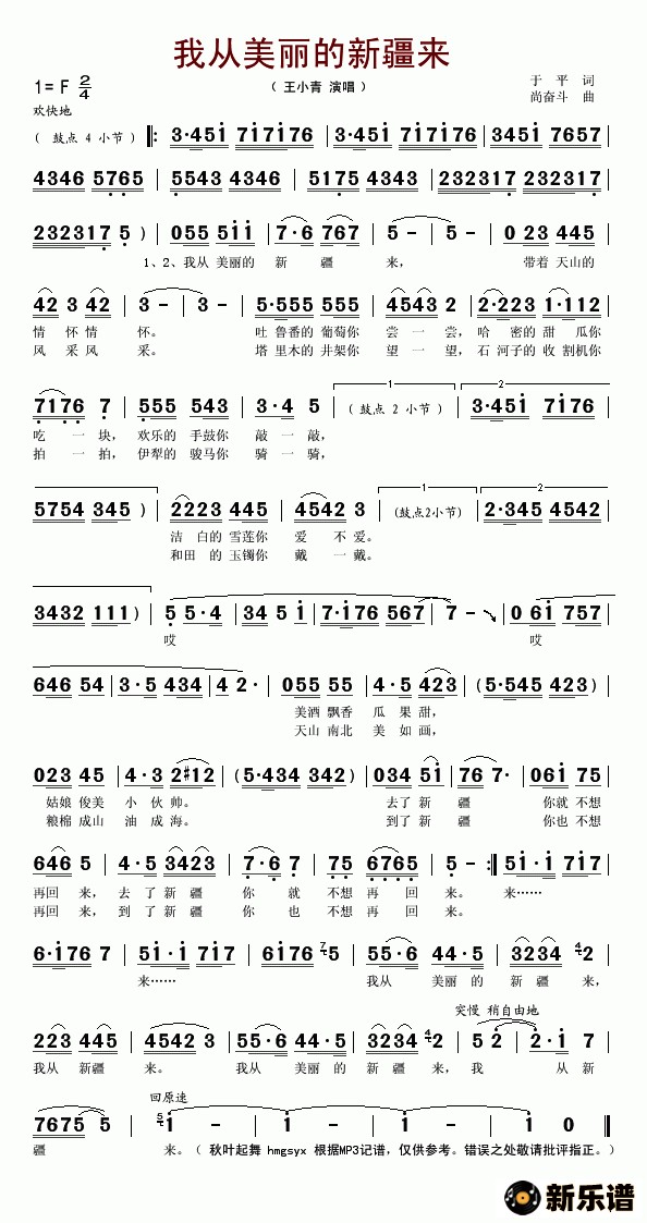 王小青演唱的我从美丽的新疆来歌词,我从美丽的新疆来简谱.
