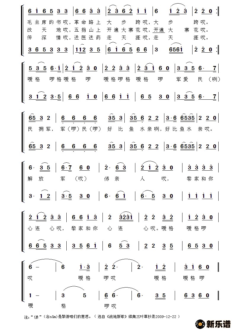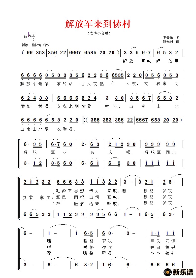 解放军来到咱(nam)黎村/广东省歌舞团演唱 相关曲谱