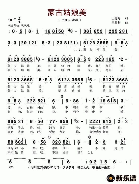 《蒙古姑娘美》简谱 吕继宏