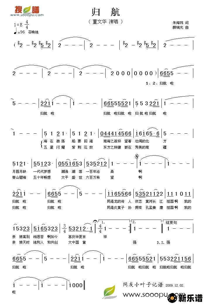《归航》简谱 董文华-小叶子制谱