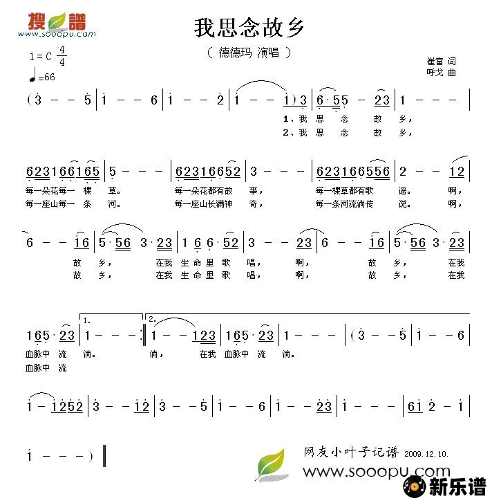 《我思念故乡》简谱 德德玛-小叶子制谱