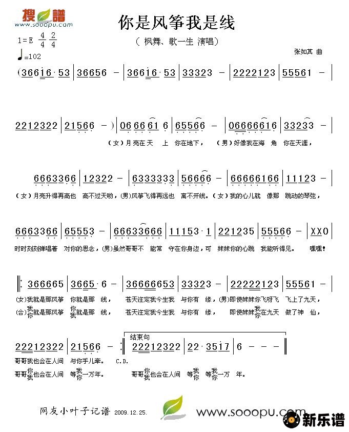 《你是风筝我是线》简谱 枫舞/歌一生-小叶子制谱