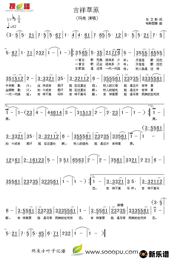 《吉祥草原》简谱 玛希-小叶子制谱