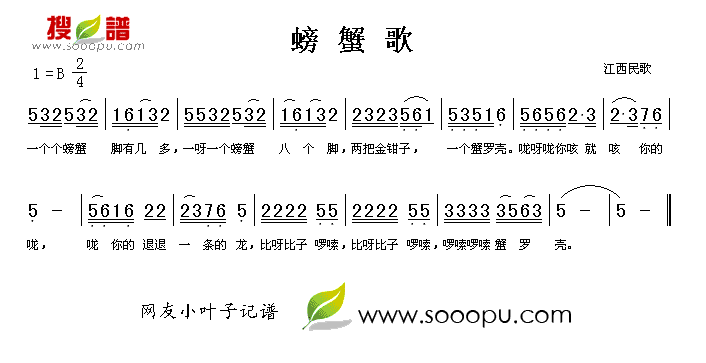 江西民歌演唱的螃蟹歌歌词,螃蟹歌简谱.