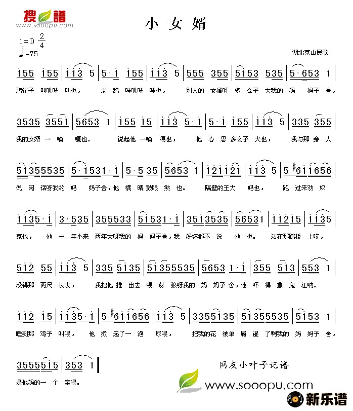 湖北京山民歌演唱的小女婿歌词,小女婿简谱.