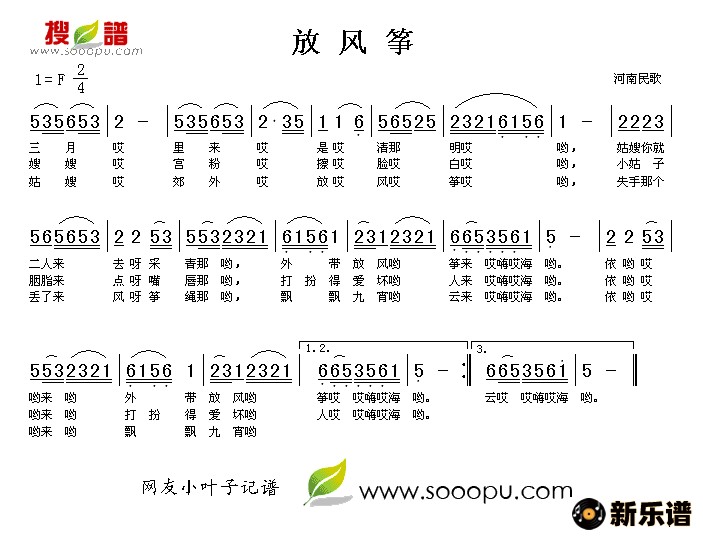 河南民歌演唱的放风筝歌词,放风筝简谱.
