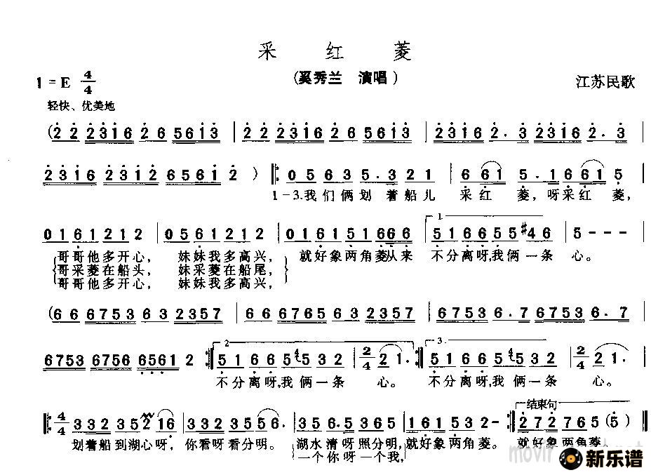 江苏民歌演唱的采红菱歌词,采红菱简谱.