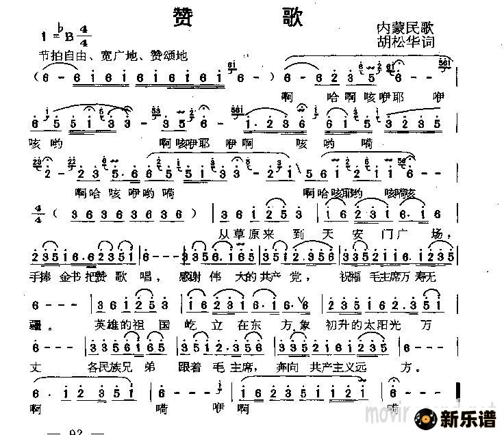 内蒙古民歌演唱的赞歌歌词,赞歌简谱.