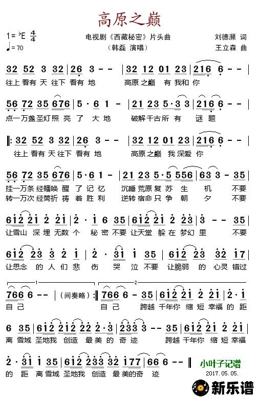 韩磊演唱的高原之巅歌词,高原之巅简谱.