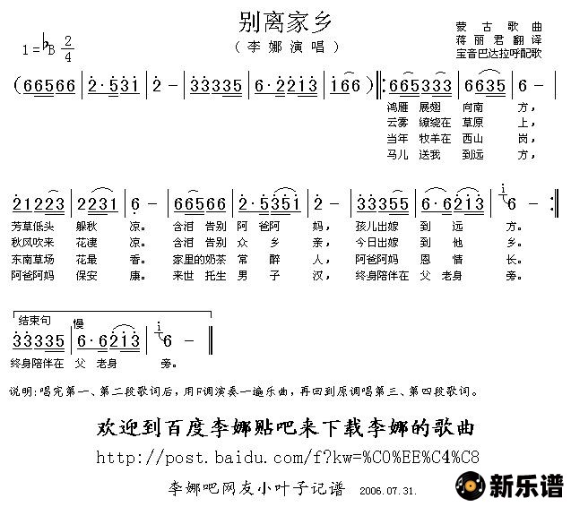 李娜演唱的别离家乡歌词,别离家乡简谱.