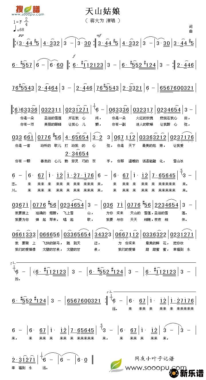 《天山姑娘》简谱 蒋大为-小叶子制谱
