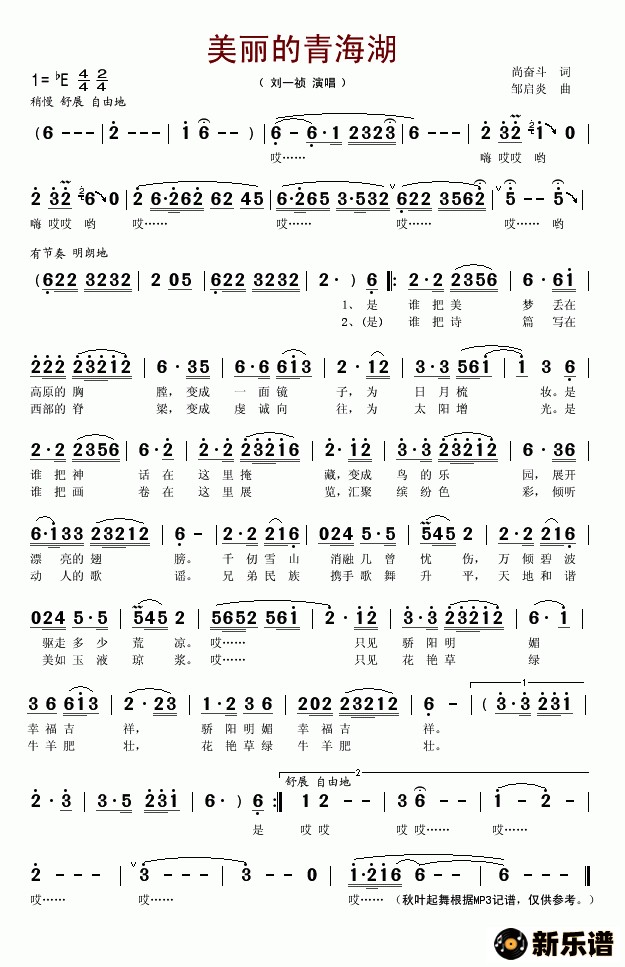 刘一帧演唱的美丽的青海湖歌词,美丽的青海湖简谱.