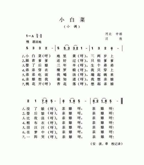 演唱的小白菜 河北民歌歌词,小白菜 河北民歌简谱.