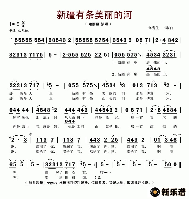哈丽旦演唱的新疆有条美丽的河歌词,新疆有条美丽的河简谱.