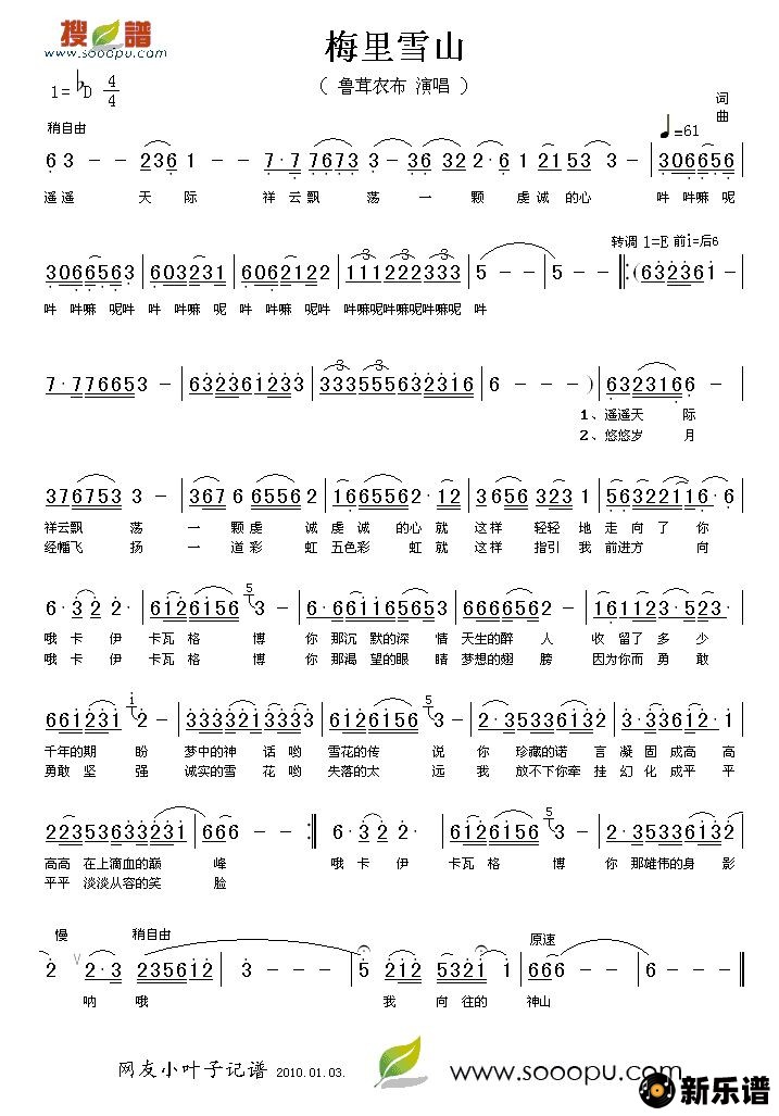 《梅里雪山》简谱 鲁茸农布-小叶子制谱