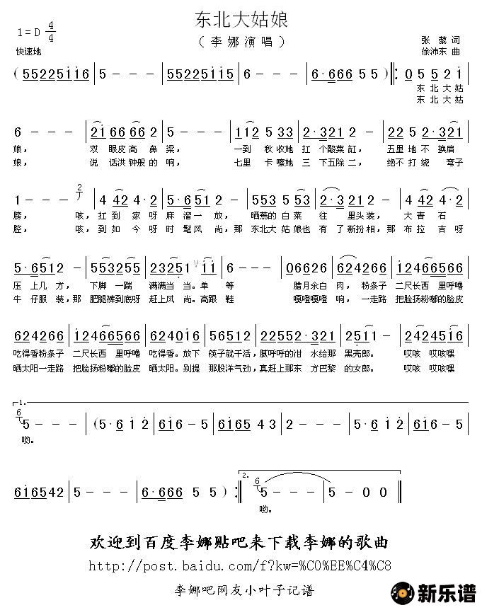 《东北大姑娘》简谱 李娜-小叶子制谱